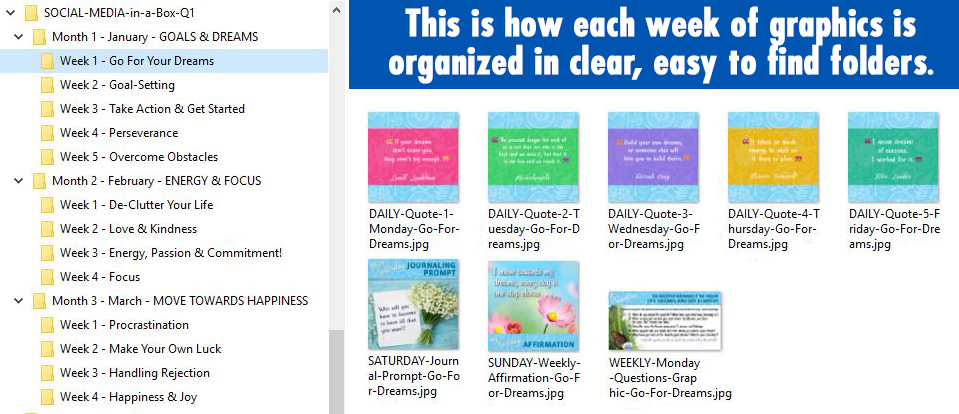 Home » Coaching Blog » Articles for Specific Niches » Get an ENTIRE YEAR (that's 365 Days!) of Ready-to-go Social Media GRAPHICS for Coaches! Get an ENTIRE YEAR (that's 365 Days!) of Ready-to-go Social Media GRAPHICS for Coaches! Last Updated: July 9, 2024 Reading Time: 6 min ShareTweet1SharePin45 SharesHow would it feel to: LOVE posting on social media? Know you have something beautiful and coachlike to post - every single day for a complete year? Easily find what you have to post? Know that what you share is relevant and interesting to your fans? Generate interest and discussion online and know that your posts are helping people? Be able to bulk-schedule weeks or months of posts at a time, and free you up to work on your business? Be proud of your social media presence? Your Social Media - Made Easy! Well we're excited to offer an ENTIRE YEAR of ready-to-go Social Media GRAPHICS in a Box exclusively designed for Coaches! This product took us a year to create - and covers you with ready-to-go daily, weekly and monthly graphics and infographics from January right through to December! It's social media made easy! See the "365 Days of Social Media GRAPHICS!" Ultimate Mega-Bundle here >> De-stress and Save Tons of Time and Energy with this exciting new product! When you told us that keeping up with social media is a drain and time-suck, we got it! We know firsthand how frustrating it can be - and how long it takes - to find and create quality content to represent your business on Social Media. And time is such a precious commodity - especially when you're a solopreneur. This Social Media Graphics Mega-Bundle frees up your time and energy to work on growing your clients and business. No more spending hours hunting for great content to share on social media! And everything is super organized and easy to find, so you know exactly what to post, when. Here's what Jen Coken said about her first purchase of Social Media in a Box: "Emma-Louise, you are my fairy godmother! The Social Media Toolkit was EXACTLY what I was looking for - it gave me great quotes to share with my followers as well as build up likes on my Fanpage and on my Instagram account. More than that, they gave me a structure that works. I can blog and do Facebook Live feeds on each week's theme, and do a free monthly webinar on the theme of the month. I can't thank you enough!" Jen Coken A Social Media Presence is Necessary for Relationship-Focused Businesses! Click to see how this product is organized These days, clients and potential clients expect us to have a Social Media presence. But more than that, social media is a great way to stay in touch with clients and potential clients - reminding them we're there when they need us... So we designed and created this product to save you time, energy and money. Get a whole YEAR of beautiful Social Media Graphics exclusively designed for coaches with topical coaching themes. The graphics are all neatly organized so it's super EASY to use - and saves you tons of time and effort. Brandable and Ready-to-use: Take your business to the next level! This package is helpfully divided into 4 quarters of the year - Q1: January to March, Q2: April to June, Q3: July to September and Q4: October to December. A total of 428 Social Media Graphics PLUS User Guides and you have everything you need to keep your social media ticking over for a complete year. Exclusively designed for life coaches: Weekly coaching themes engage and inspire! Grow and deepen your online relationships: Your fans and followers will love and share these beautiful graphics! Brandable: Ready-to-use "as is" and you can also add your own branding! Save Time! No more hunting for quality posts to share on social media. Attractive: Bold and beautiful, boost your brand and establish yourself as a "go to" coach. Less Stress: Easy to use and neatly organized in folders by month, week and day. Use on a multitude of social media channels including Facebook, Twitter, Pinterest, Instagram, Google+, LinkedIn and more! Another Happy Customer (and yes, Kate - we now offer a full year!) Hi! I just want to thank you for creating the AWESOME social media pack. It's so easy to use, and my Facebook followers look forward to each new post. One fan said "these are great & please keep posting" I'm hoping you will come out with more packs so we have a full year? That would be wonderful!! Kate Rodrigue at Improving by Design Check out "365 Days of Social Media GRAPHICS!" here >> Carefully Chosen Monthly and Weekly Coaching Themes This product is a comprehensive, balanced and carefully crafted set of graphics that take you through 52 weeks of hand-selected coaching topics. Here are the 12 Monthly & 52 Weekly Coaching Themes: JANUARY - Goals & Dreams Go For Your Dreams Goal-Setting Take Action & Get Started Perseverance Overcome Obstacles FEBRUARY - Energy & Focus De-Clutter Your Life! Love & Kindness Energy, Passion & Commitment! Focus MARCH - Move Towards Happiness! Procrastination Make Your Own Luck Handling Rejection Happiness & Joy APRIL - Confidence Gremlins & Critics Strengths Courage Passion MAY - The Benefits of Coaching Finding Fulfilment Be Happier Limiting Beliefs Celebrate Coaching (align with Coaching Week*) Be a Leader in Your own Life JUNE - Authenticity Know Yourself Be Authentic Love Yourself Intuition Trust Yourself JULY - Life Balance & Self-Care Finding Balance Self-Care The Value of Fun Set Boundaries Live Your Values AUGUST - Inspiration & Taking Action Get out of Comfort Zone Limiting Beliefs Get Inspired & Take Action Awe & Wonder SEPTEMBER - Succeed in Life Prioritise What Matters Determination Successful Habits Learn From Mistakes OCTOBER - Inner Strength Inner Strength Inner Beauty Stop Worrying What Others Think! No to Perfectionism NOVEMBER - Relationship with Self, Life & Others Solitude Freedom Toxic People Gratitude & Thankfulness Friendship DECEMBER - Let it Go & Celebrate! Saying No Manage Stress Forgiveness Celebrate * 