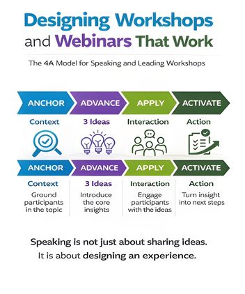 Home » Coaching Blog » Workshops & Webinars » Designing Leadership Workshops and Webinars That Stick with the 4A Model | by Jennifer Britton Designing Leadership Workshops and Webinars That Stick with the 4A Model | by Jennifer Britton Published: April 23, 2026 Reading Time: 2 min Jennifer Britton ShareTweetSharePin0 Shares Leaders, coaches, and consultants are speaking more than ever. Short webinars. Leadership workshops. Lunch-and-learn sessions. Conference presentations. Yet many of these sessions feel rushed, surface-level, or quickly forgotten. The issue usually isn’t time. It’s design. When workshops and webinars are intentionally structured, even a short session can spark insight, meaningful conversation, and practical action. One framework I often use when designing leadership sessions is what I call the 4A Model. The 4A Model for Speaking and Leading Workshops Effective workshops and webinars typically move through four stages: Anchor → Advance → Apply → Activate Each stage helps participants move from awareness to action. 1) Anchor (Context) Begin by grounding participants in the topic. Why this topic? Why now? Why does it matter to this audience? What’s in it for you? (WIIFM) A strong opening might include: A question that invites reflection (What….) A short story or scenario (Consider this…) A data point or trend (Did you know…) A quick poll or chat prompt (Share with us….) Anchoring helps participants connect the topic to their own experience and prepares them to engage. 2) Advance (Core Ideas) Next, introduce the key insights you want participants to take away. In shorter sessions, restraint is important. Focus on three core ideas. Not eight. Not twelve. Three. When participants can clearly see the structure of the ideas you are sharing, they are much more likely to remember and apply them. 3) Apply (Engagement) Engagement is at the heart of great conversations. Learning deepens when participants actively engage with the material. Application or engagement might include: Small group discussions Breakout conversations Reflection questions Chat-based prompts in virtual sessions A short activity to test an idea Even brief interaction helps participants translate insight into relevance. For those leading in the virtual realm, consider how you can integrate the Five Engagement Levers™ - Chat, Polling, Annotation, Breakouts and Whiteboard. 4) Activate (Action) The final stage helps participants turn insight into action. Before closing the session, invite participants to reflect: What is one idea that stood out to you today? What will you try this week? What conversation might you initiate? Ending with a clear next step helps extend the impact of the session beyond the room or the webinar. Design Principles for Leadership Workshops and Webinars Whether you are leading a 60-minute webinar or a half-day workshop, a few design principles can help increase impact. Depth over breadth Focus on fewer ideas and explore them meaningfully. Interaction every 7–10 minutes Frequent engagement keeps attention and energy high. Use one clear visual model A framework helps participants organize their thinking. Offer one practical tool Something participants can immediately apply. Create a moment of reflection Reflection turns information into insight. Workshops and webinars should spark thinking and conversation, not overwhelm participants with content. Common Pitfalls When Leading Sessions Even experienced presenters sometimes fall into predictable traps: Too much content Too little interaction No opportunity for application No clear integration at the end Another missed opportunity is continuation. If you want your workshops and webinars to have a longer impact, consider offering something participants can return to afterwards, such as: Reflection questions A short worksheet A peer discussion guide A list of additional resources These simple additions help sustain learning beyond the session itself. Wrap Up Speaking and leading workshops is not just about sharing ideas. It is about designing an experience that engages your audience. When sessions are intentionally structured, even a short webinar or workshop can create meaningful learning and forward momentum. The 4A Model — Anchor, Advance, Apply, Activate — provides a simple structure for designing sessions that are engaging and memorable, and move people into action. If you enjoyed this article, you may also like: How to Use Breakout Rooms: 10 Tips to Supercharge Webinars & Groups! by Jennifer Britton Two Screens, Two Missions: Webinar vs Virtual Training (and how to nail both!) Tried & Tested FREE Workshop Feedback Form (with 7 Great Reasons to use this Form!) Contributing Author: Jennifer Britton, MES, CHRP, CPT, PCC-ACTC, has influenced a generation of coaches in the realms of team and group coaching. You may have read her writing (she’s the author of 7 books), including Effective Group Coaching (Wiley, 2010), the first book in the world to be published on the topic of group coaching; From One to Many: Best Practices for Team and Group Coaching; or her latest, Reconnecting Workspaces: Pathways to Thrive in the Virtual, Remote and Hybrid World (2021). In 2025 Jennifer is leading a series of workshops around Coaching and Change, supporting coaches via Experiential Tools Under the Conversation Sparker Experiential Roadshow™. You can bring her in for a half-day or full day workshop. Since 2006, Jennifer's Group Coaching Essentials (10 CCEs) and Advanced Group and Team Coaching Practicum (10 CCEs) programs have become known as the must-do training in the area of group coaching. The two courses have now grown into ten distinct courses that group and team coaches can take – whether coaches want to work towards the ACTC (Advanced Credential for Team Coaching) or simply want to develop their practice.The two courses have now grown into ten distinct courses that group and team coaches can take – whether coaches
